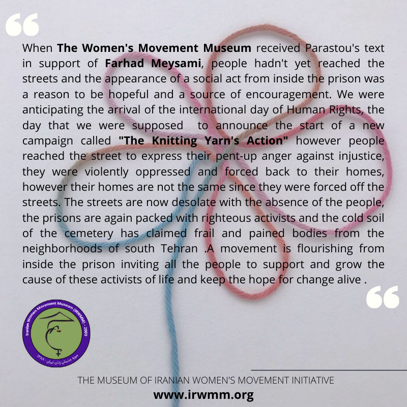 March 28, 2020When The Women’s Movement Museum received Parastoo’s text in support of Farhad Meysami, people hadn’t yet reached the streets and the appearance of a social act from inside the prison was a reason to be hopeful and a source of encouragement .